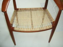 座の部分が籐で編んであるデンマーク製の有名な椅子です。籐が切れたので編み直したいとのご依頼です。5mm巾の籐の皮で編みました。お客様のご指定で見た目のデザインはそのままで椅子に通す部分はお客様ご指定の編み方です。