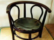 応接セットの椅子でしょうか。座が破れたための修理です。微妙にカーブしていて座り心地の良い椅子です。色は付けず自然のままがご希望でしたので今は