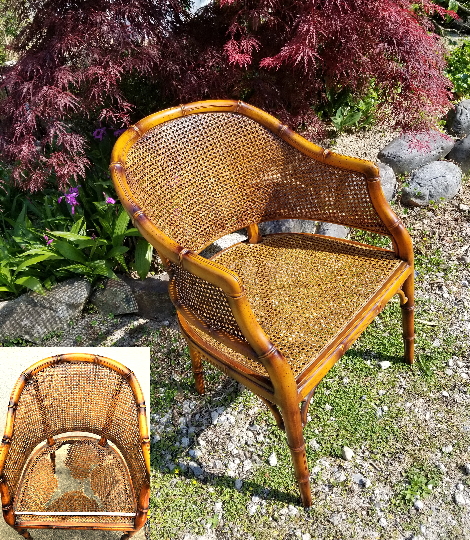 きっと思い出深い椅子です。背の部分の籐が破れていますがフレームに使ってある籐はしっかりしていますので修理しました。5mm巾の生と呼ばれている籐の皮で編みました。これでまだまだ使い続けることができます。ありがとうございます。
