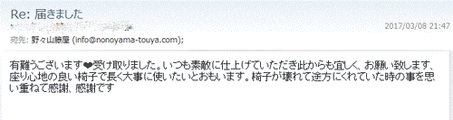メールにあるよう思い出の椅子の修理。大変お待たせしたので申し訳なく思っていましたら、こんなうれしいメール届きました。